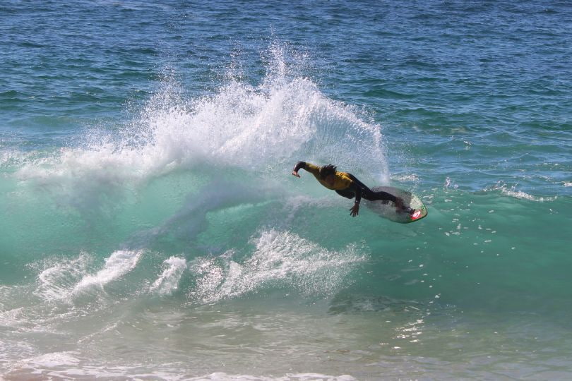 スキムボードとは、波と呼吸を合わせるように波と遊ぶ